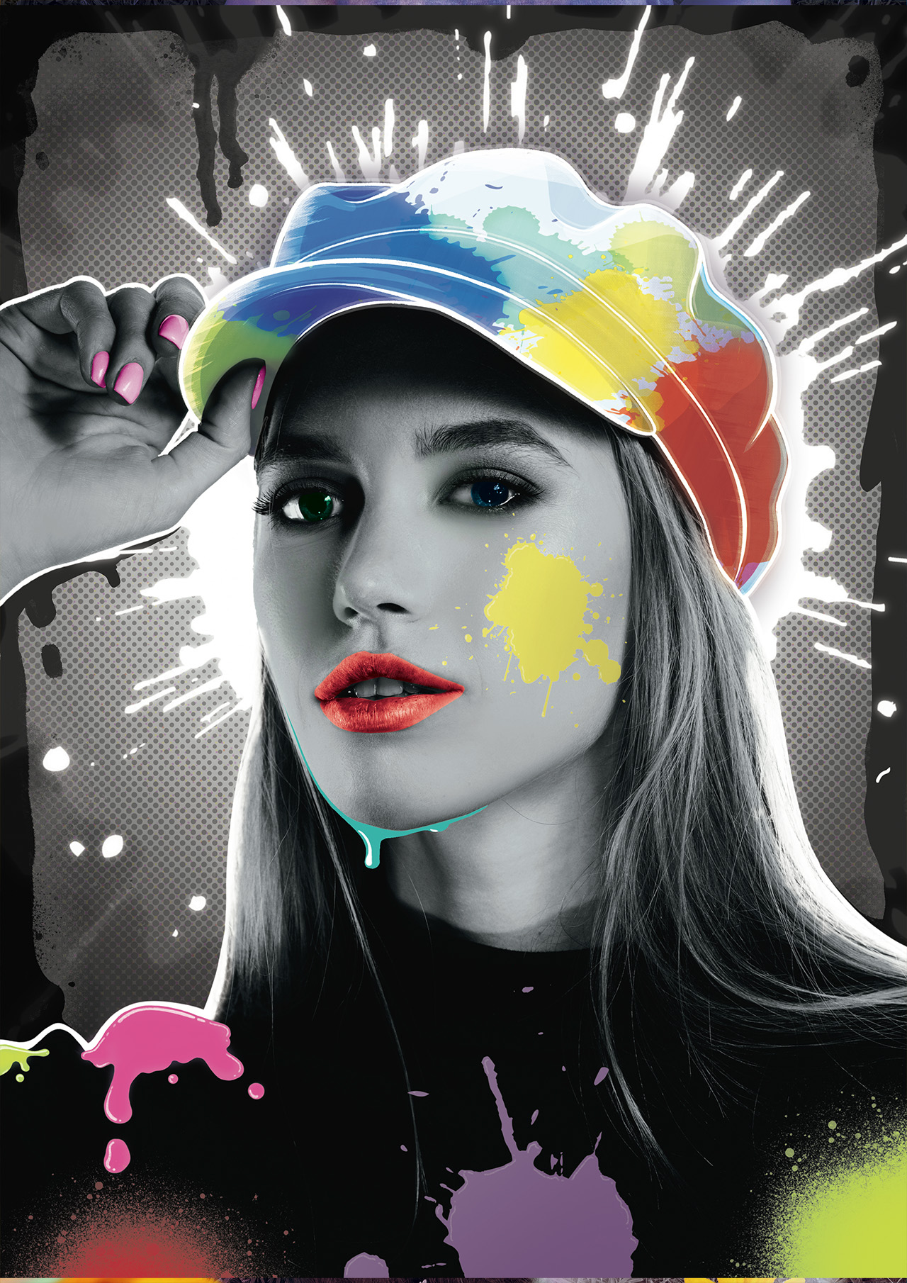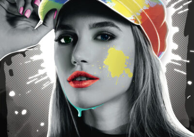 I aimed for a portrait where the vibrant colours are in the form of paint, and are the main highlight. The person and background will be monotone to further bring attention to the vibrant colours and paint. The message I wish to convey is something along the lines of the colours being representative of imagination and creativity.